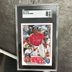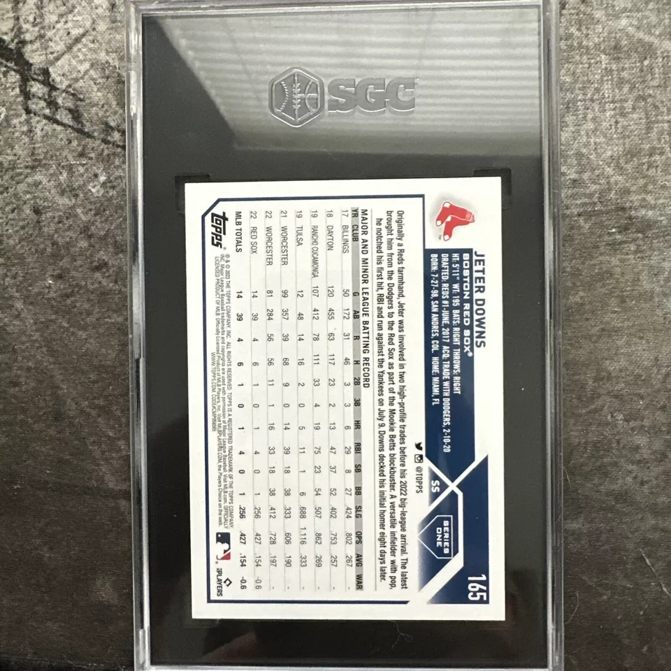 A 2023 Topps Series 1 trading card featuring Jeter Downs of the Boston Red Sox. This sports trading card is graded an 8 by Sportscard Guaranty Corporation (SGC). The card is part of the 2023 Topps set and showcases Downs in his Boston Red Sox uniform. It is a Major League (MLB) baseball card and is not autographed. The card number is 165 in the set.