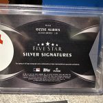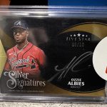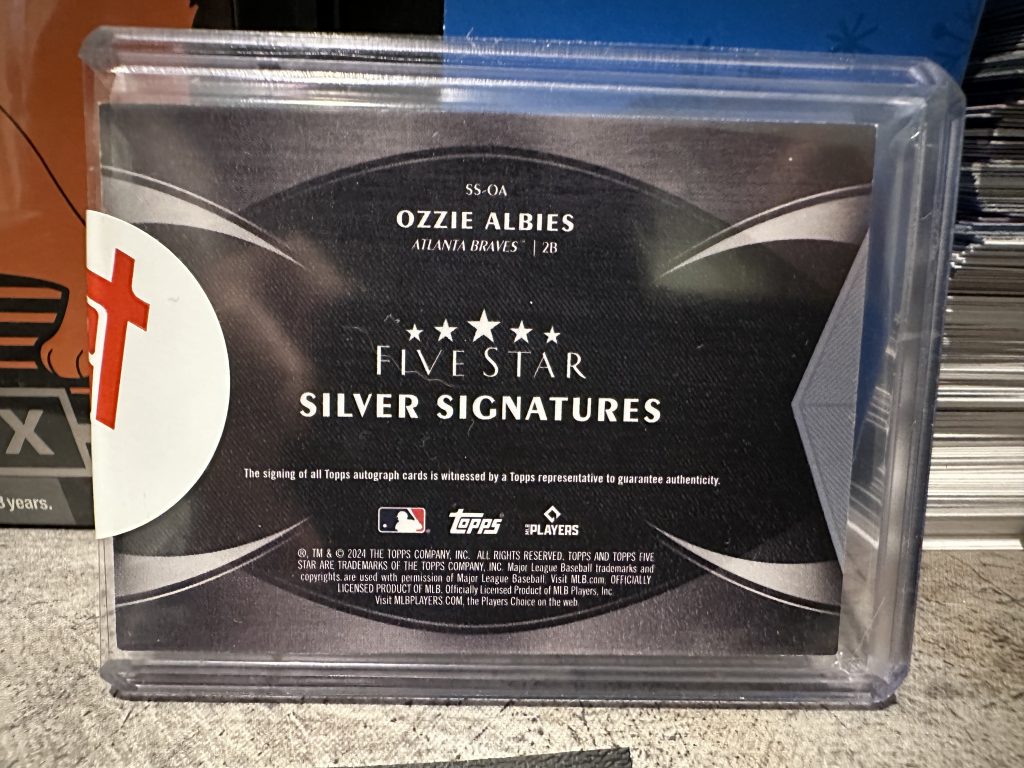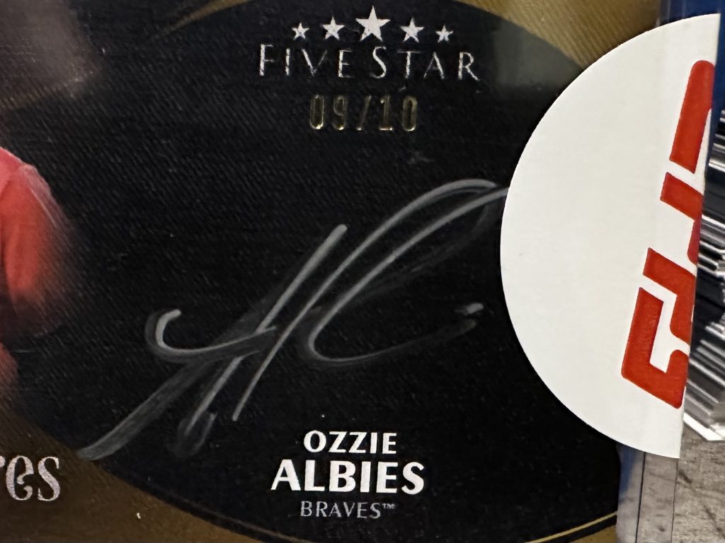 2024 Topps Five Star Ozzie Albies Silver Signatures trading card featuring an autograph from Ozzie Albies of the Atlanta Braves. This limited edition card has a print run of 10 and is serial numbered 09/10. It is made of 180 Pt. card stock and is an original, licensed reprint. The card is part of the Signatures parallel variety and includes authentication by Topps.