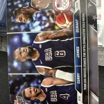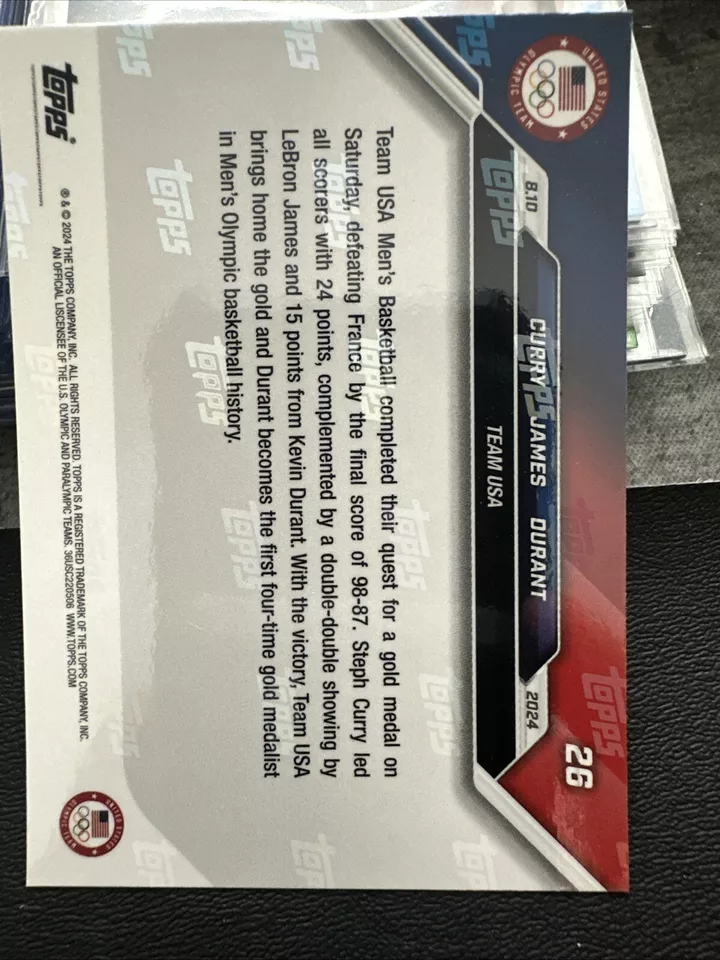 2024 Topps Now sports trading cards featuring players Stephen Curry, LeBron James, and Kevin Durant from Team USA’s victory over France in the Olympic Games. The cards are made of card stock and come from a limited print run of 588,030. The cards are standard size and depict the players in their respective team jerseys, including the Golden State Warriors, Phoenix Suns, and Los Angeles Lakers.