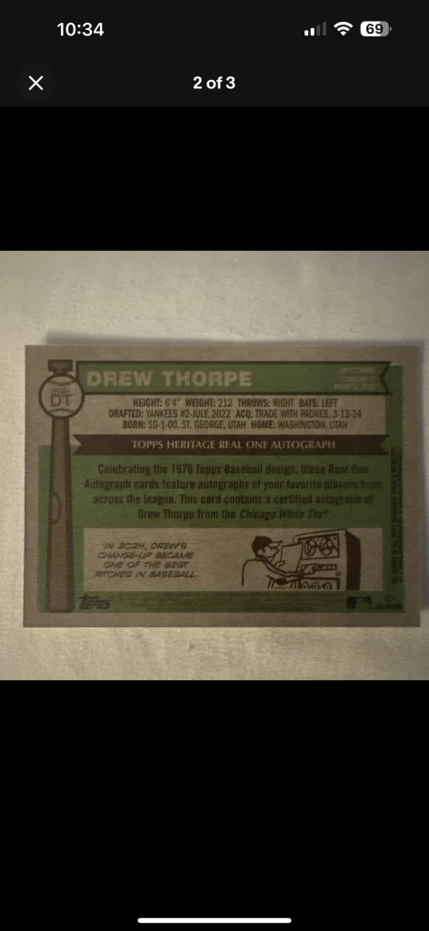 2025 Topps Heritage DREW THORPE RC Real One AUTO Chicago White Sox Rookie ROA-DT