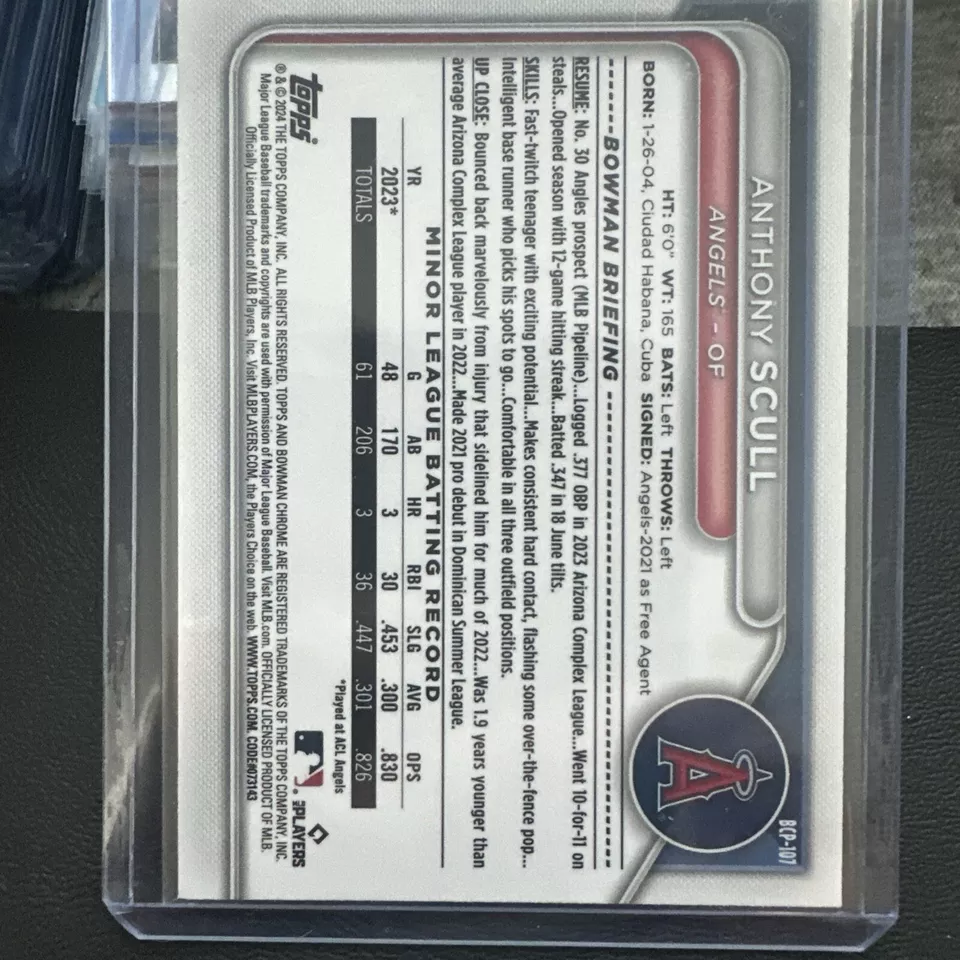 This is a 2024 Bowman Chrome Prospect trading card of Anthony Scull from the Los Angeles Angels. It features a Shimmer Orange Refractor parallel with a print run of 25 cards. The card is numbered BCP-107. It is manufactured by Bowman for Major League Baseball and showcases the player in the MLB season of 2024.