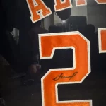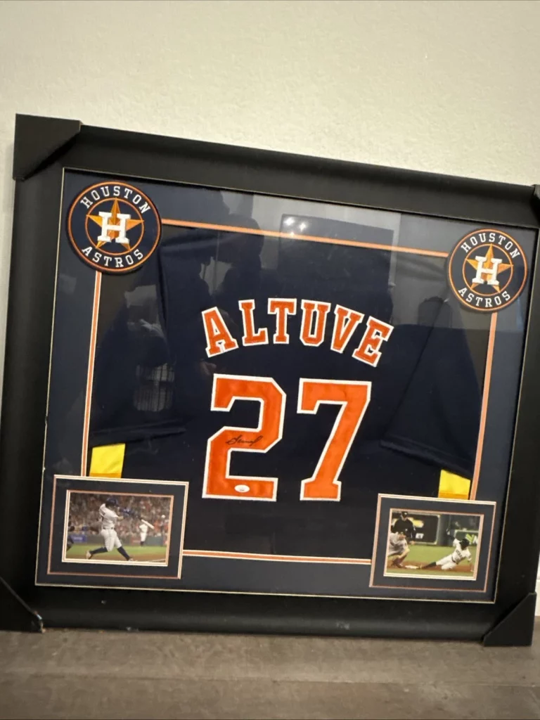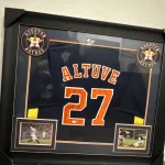 The product is an authentic Nike framed jersey signed by Jose Altuve of the Houston Astros. The autograph has been certified by JSA, an authenticator of sports signatures. This collectible item is a unique piece for fans of baseball and the Houston Astros, showcasing a genuine autograph from a prominent player. Made in the United States, this framed jersey is a must-have for any sports memorabilia collector looking to add a special piece to their collection.