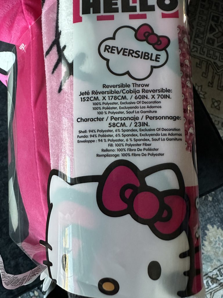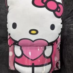 A Hello Kitty Reversible Throw & Cloud Pillow Set in a limited edition design, featuring a pink color with hearts and the iconic Hello Kitty character. Made from 100% polyester, this non-standard size throw is perfect for all seasons and is ideal for fans of cats and kittens. The set does not offer personalization options.