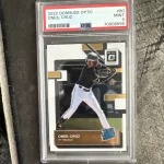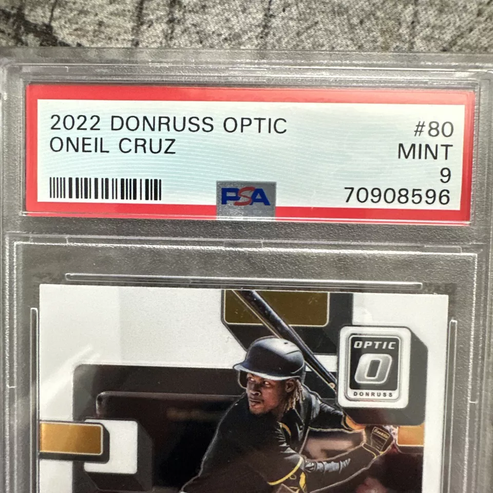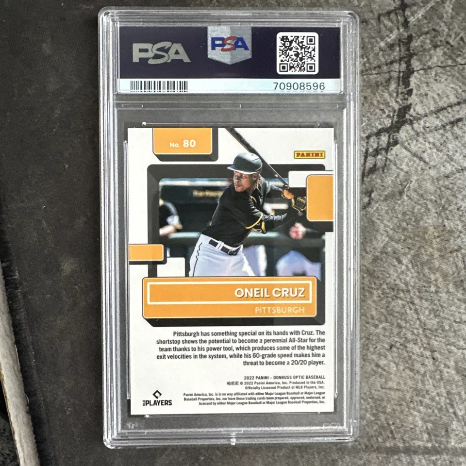 2022 Oneil Cruz Panini Donruss Optic Rated Rookie Silver Prizm #80 is a graded sports trading card featuring the Pittsburgh Pirates player in the Major League (MLB). The card, graded 9 by Professional Sports Authenticator (PSA), includes a hologram, is part of the Silver Prizm parallel/variety, and is from the 2022 season.