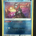 The “Radiant Greninja” card is from the Pokémon TCG set “Swsh10: Astral Radiance.” It features Greninja, an amphibian Pokémon with 130 HP, as a Radiant Rare card. Illustrated by Souichirou Gunjima, this English card is a Basic Pokémon with the card number 046/189 and a Holo finish. It is part of a collectible card game manufactured by The Pokémon Company.