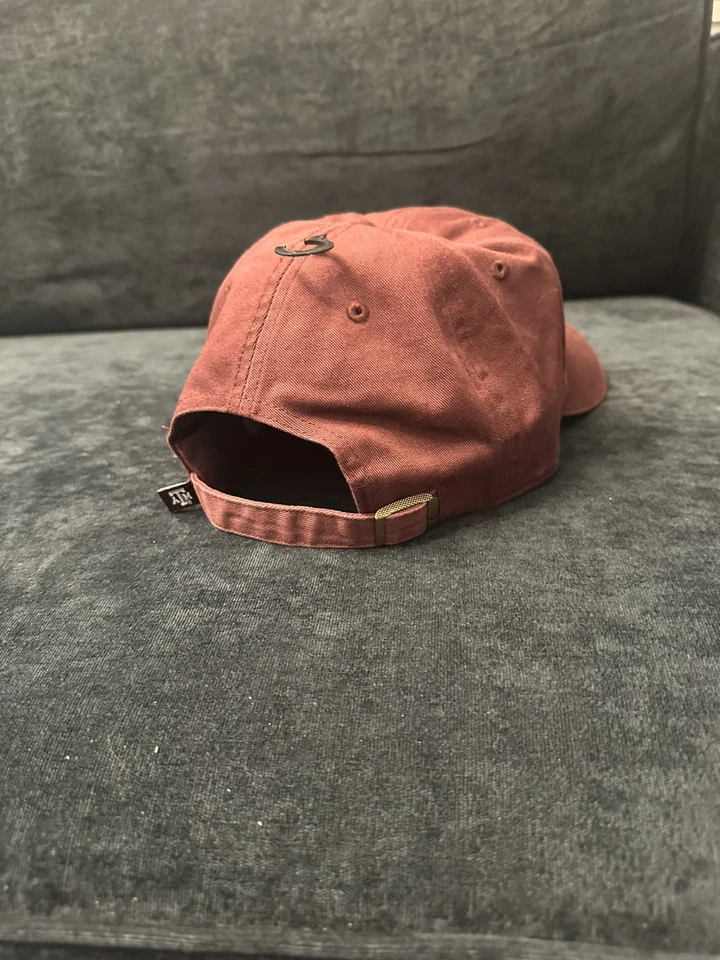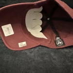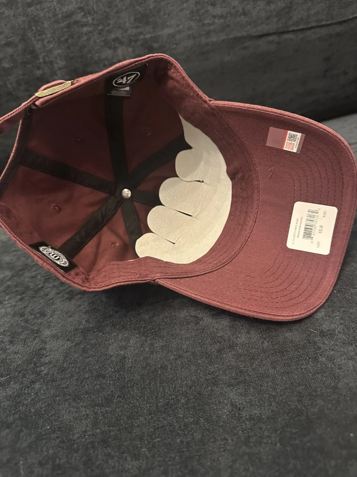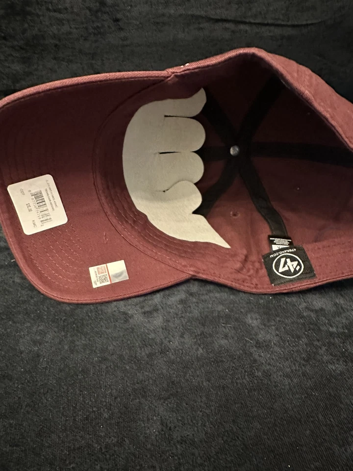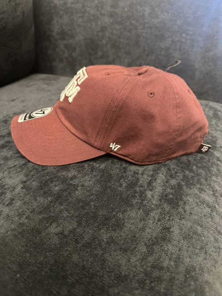 This is a maroon strapback hat featuring the Texas A&M Aggies logo. It is officially licensed and made from 100% cotton. The hat is designed in a clean and classic style by ’47 brand. It is a one size fits all cap suitable for adults. The product is brand new with tags.
