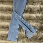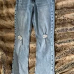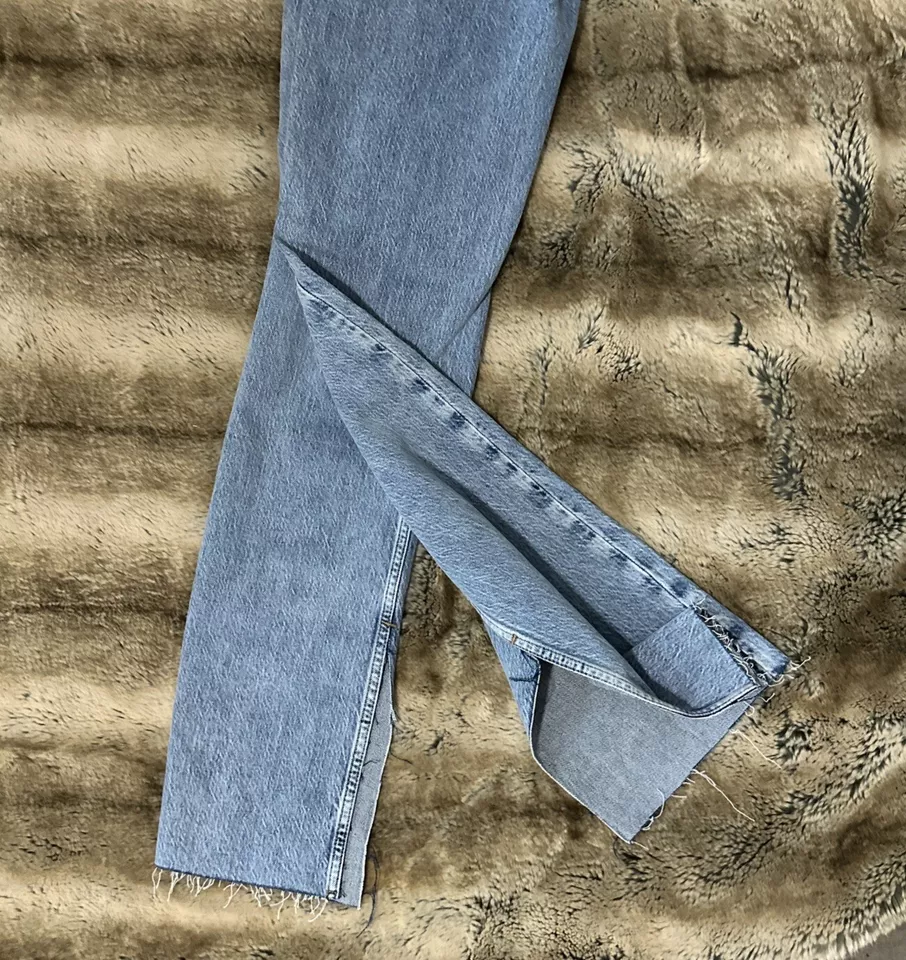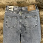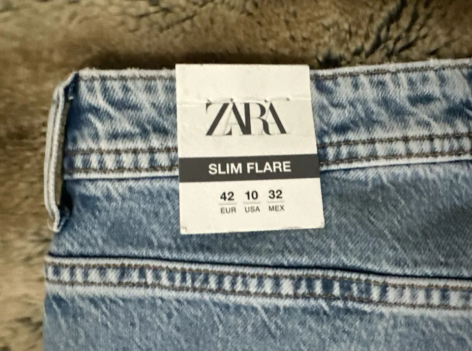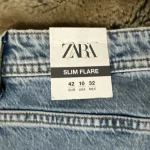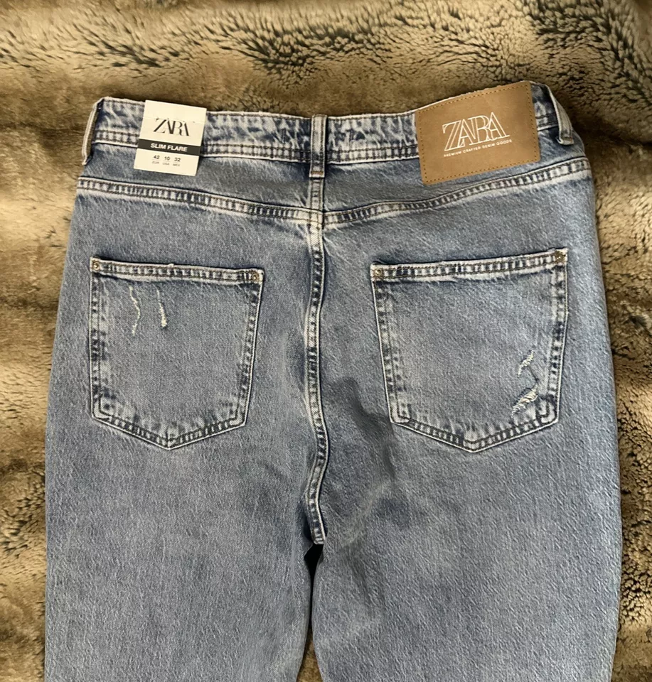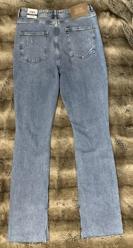This Zara High Rise Slim Bootcut Slit Leg denim jeans in size 10 feature a slim flare fit with a solid blue color. The jeans have a zip closure, button accents, and a 5-pocket design. Made of a cotton blend fabric with a medium wash, they offer comfort and style for the spring season.